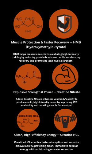 This high-performance strength formula combines three elite ingredients — Creatine Nitrate, Creatine HCL, and HMB — each selected for their ability to support power output, endurance, and muscle recovery. Together, they help the body maintain stronger lifts, recover more efficiently, and perform with greater stability under pressure.